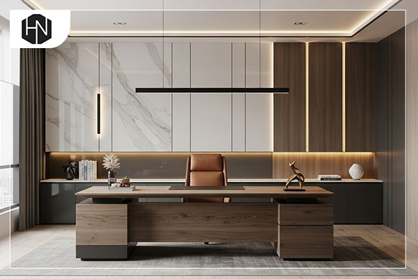 نورپردازی چندلایه و هدفمند: نورپردازی یکی از عوامل کلیدی در طراحی فضاهای مدیریتی است. ترکیب نور طبیعی با نورپردازی مصنوعی حرفهای، میتواند فضا را هم رسمی و هم دلپذیر جلوه دهد. استفاده از نور مخفی در سقف و دیوارها، چراغهای دکوراتیو، نور متمرکز روی میز کار و تابلوهای هنری، باعث ایجاد عمق و شخصیت در فضا میشود. نورپردازی صحیح همچنین به کاهش خستگی و افزایش تمرکز کمک میکند.